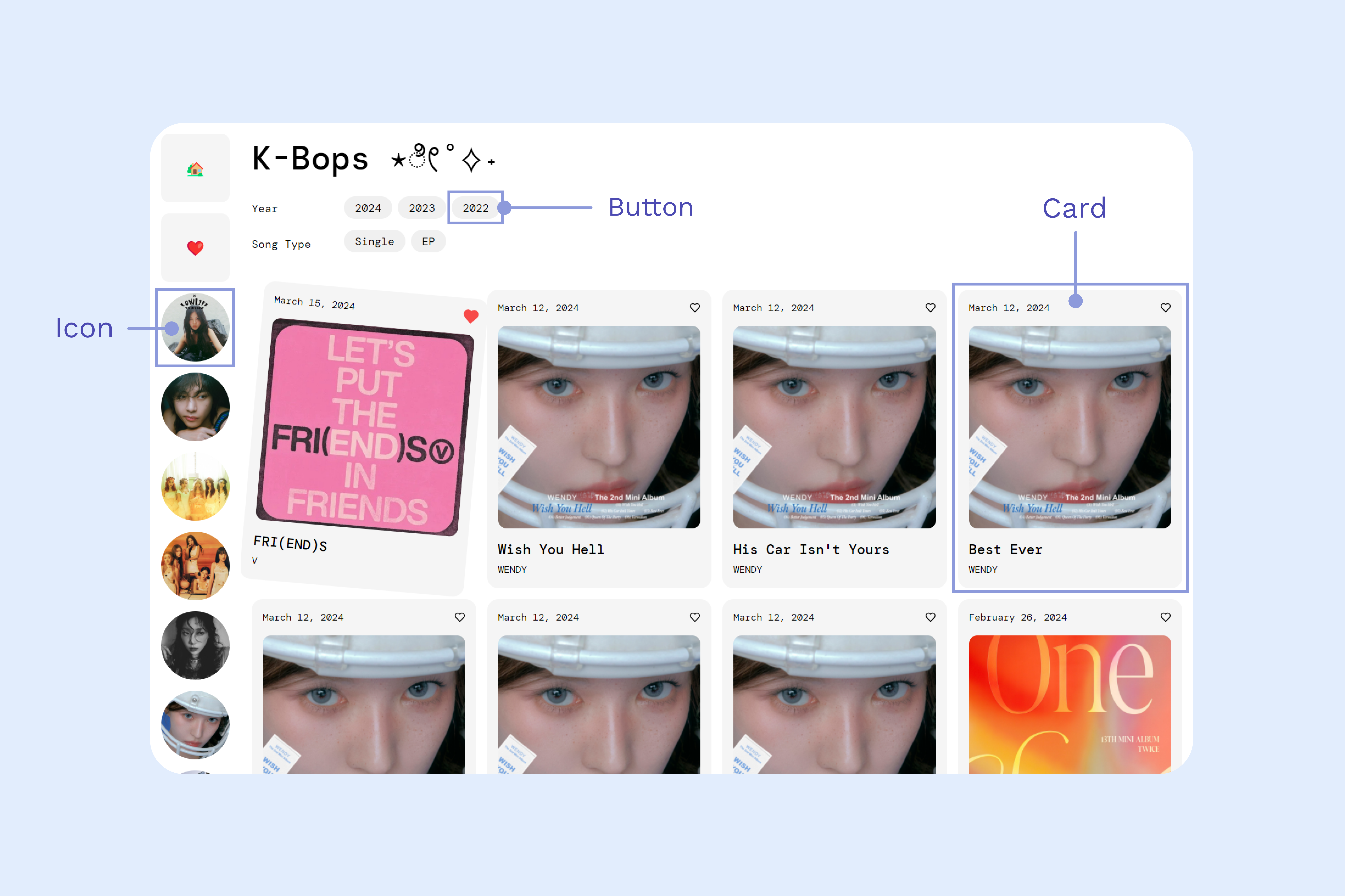 In developing the K-Bops interface, I drew inspiration from Spotify's visual design, featuring a left sidebar and main content area. Functionality-wise, the application allowed users to filter songs by artist, release year, and song type, with additional features for favoriting and unfavoriting songs.